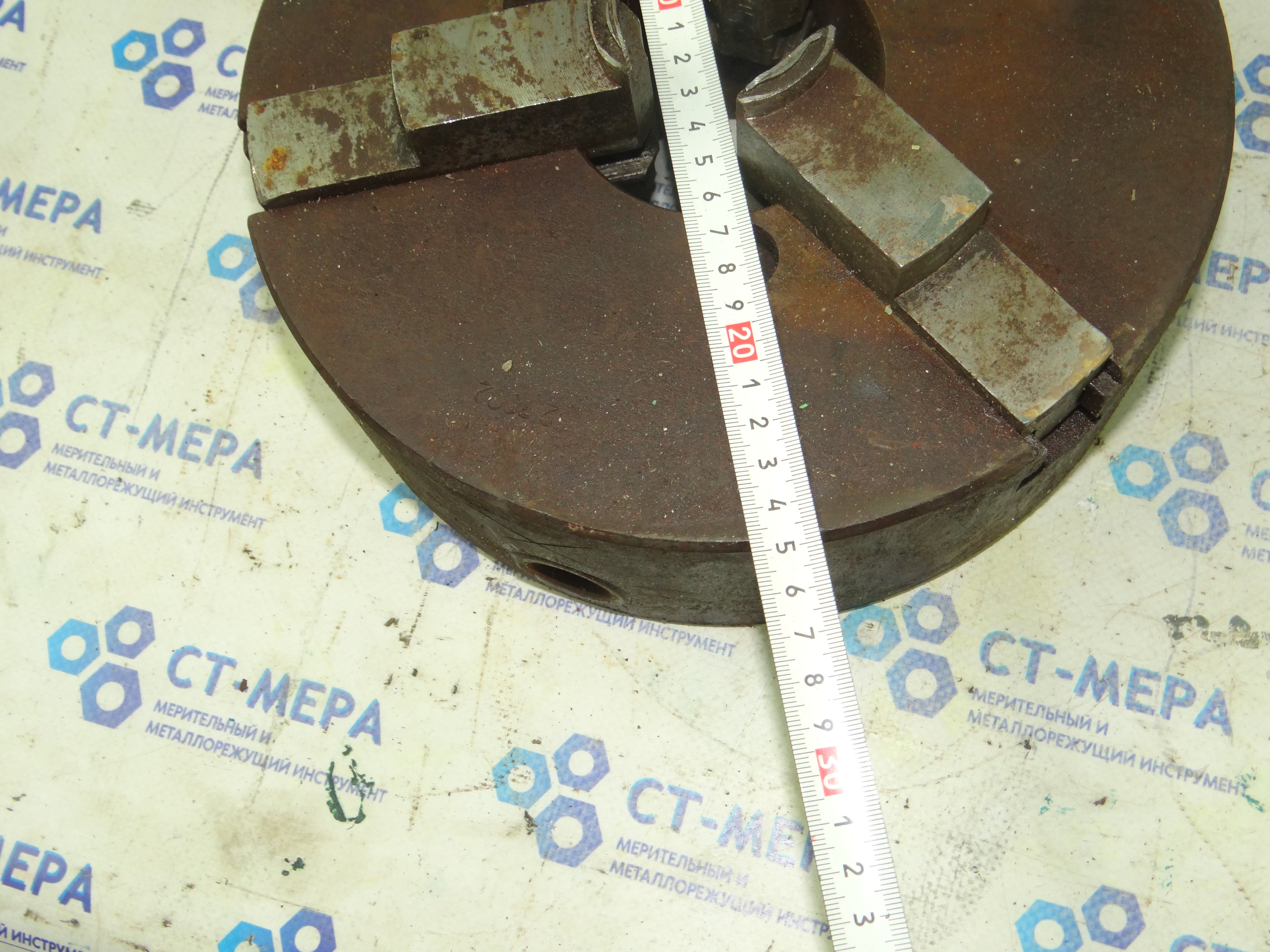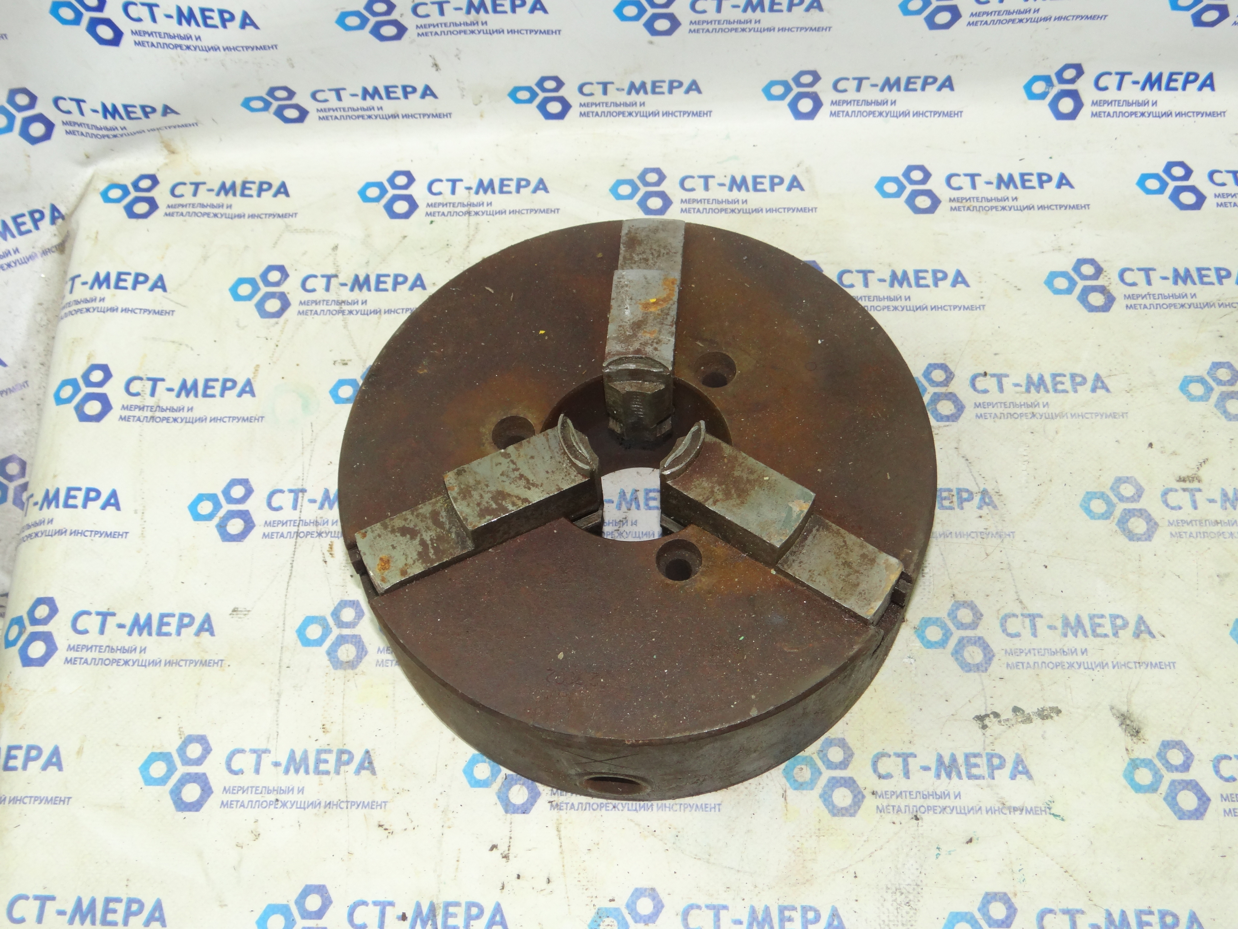 самоцентрирующийся трехкулачковый токарный патрон диаметром 250 мм. Сделано в СССР/СНГ (ориентировочно завод БелТАПАЗ или Псков).
